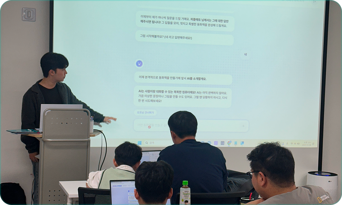 '가족과 함께하는 AI 크리에이터 캠프'는 회사 복지 프로그램 중 만족도 1위를 기록했습니다. 주말에 임직원과 초등학생 자녀가 함께 AI로 그림책, 영상을 만드는 과정이었는데요. 부모는 최신 AI 기술을 배우고, 아이는 창의력을 키우고, 무엇보다 함께 작품을 만들며 소통하는 시간이 정말 값졌다는 피드백이 쏟아졌어요. 가족 유대감 강화와 직원 역량 개발을 동시에 잡은 프로그램이었습니다.